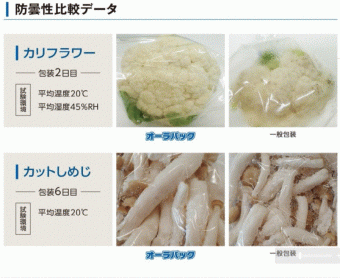 オーラパックは、青果物の水分蒸散が少ないため蒸れにくく、袋内部への水滴の付着を抑制することができます。